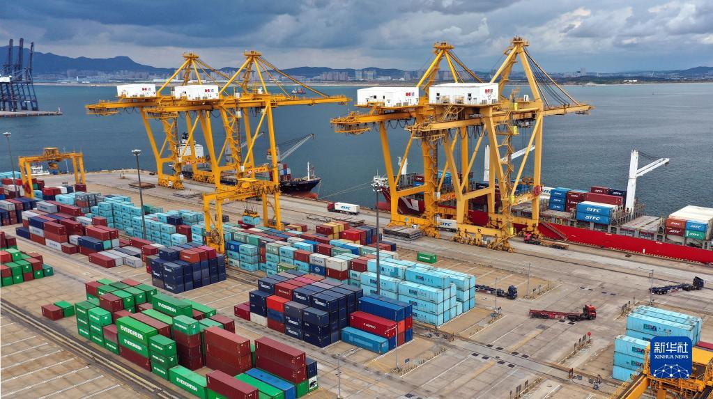 在遼寧省大連市遼寧港口集團大連港集裝箱碼頭,貨輪在裝卸集裝箱。新華社記者 姚劍鋒 攝