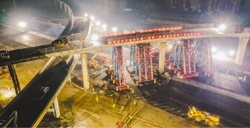 圖為2月23日凌晨,京哈高速公路葫蘆島互通B、C匝道橋兩座跨線橋拆除現場。