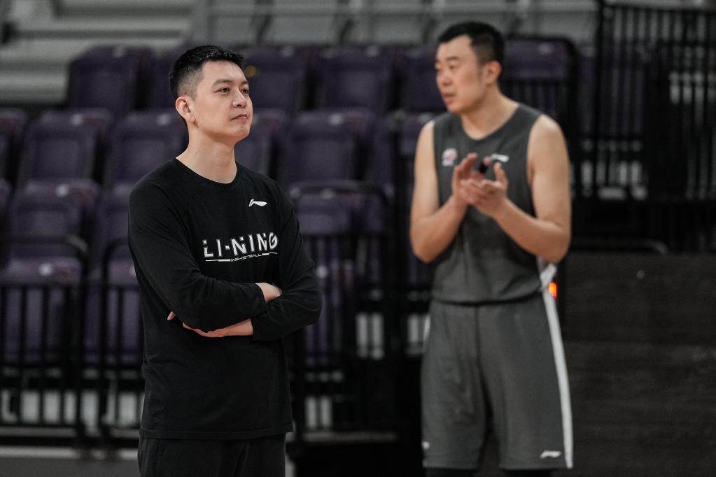 2月24日,遼寧本鋼隊主教練楊鳴(左)觀看隊員訓練。新華社記者 潘昱龍 攝
