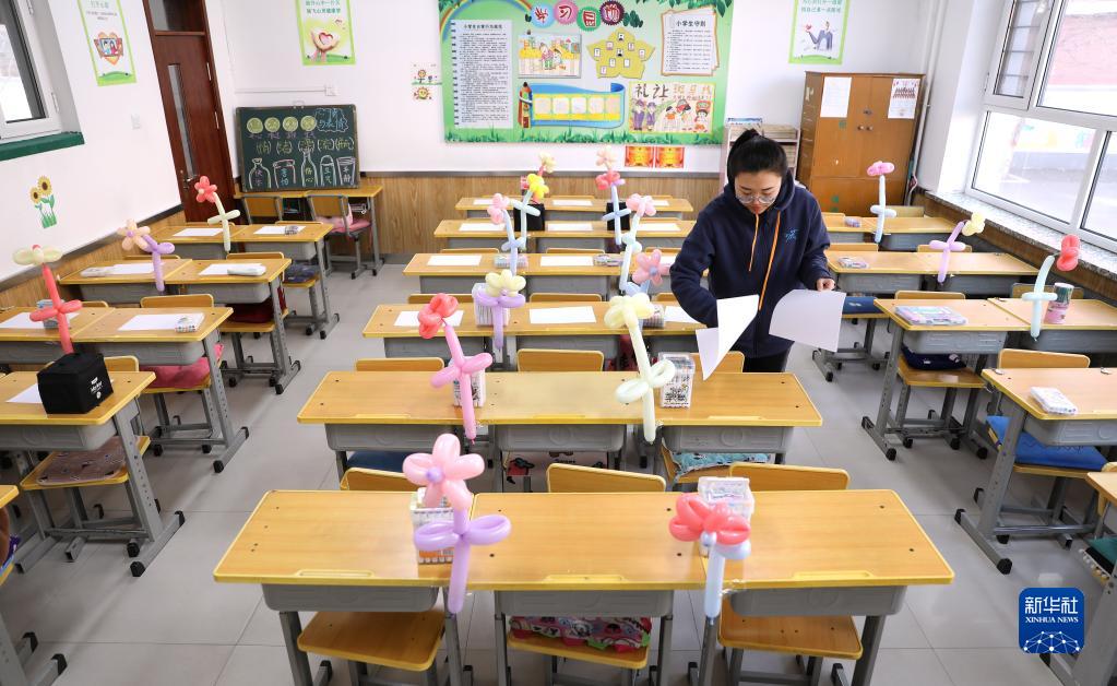 2月28日,遼寧省臺安縣逸夫小學教師尹岐在班級里為開學第一課——心理課準備教具。新華社記者 姚劍鋒 攝