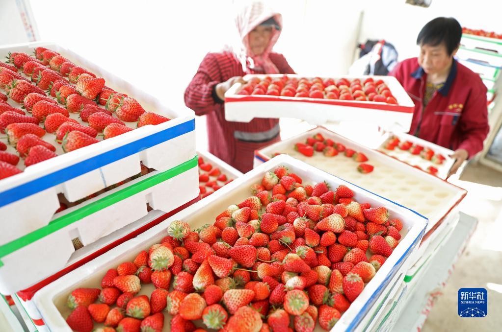3月2日,在遼寧省臺安縣富家鎮新生村草莓種植大棚,村民將剛剛采摘的草莓裝箱。新華社記者 姚劍鋒 攝