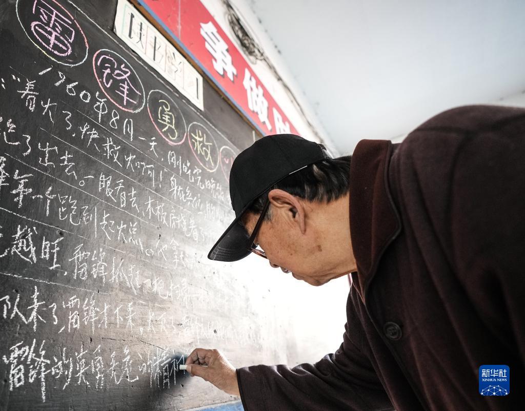 3月4日,“百姓雷鋒”姚恩亮在制作黑板報。新華社記者 潘昱龍 攝
