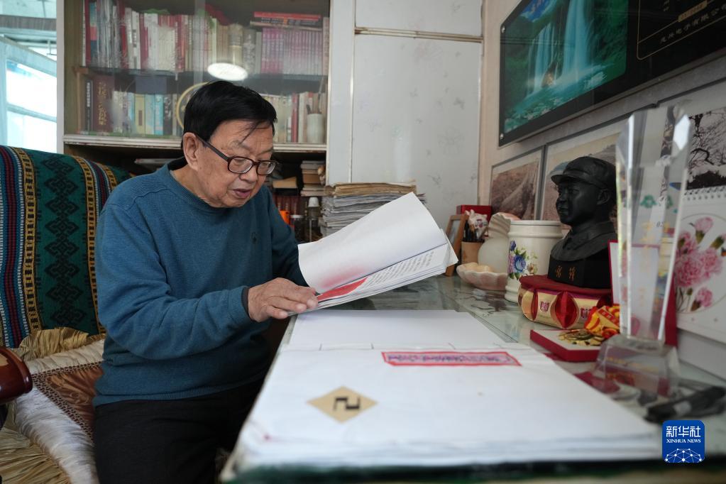 3月4日,“百姓雷鋒”姚恩亮在家中整理制作黑板報材料。新華社記者 潘昱龍 攝