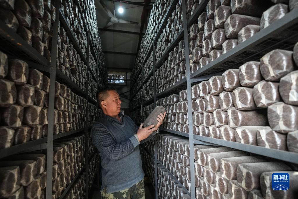 3月4日,“百姓雷鋒”侯清林在查看菌棒的情況。新華社記者 潘昱龍 攝