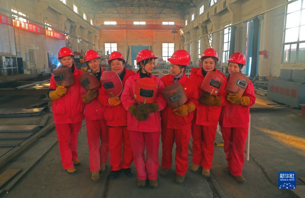 這是女子焊工班成員駱建寧、江遠芳、謝金穎、王喜蓮、李文靜、楊景愛、余容(從左到右)在焊接車間合影(2月27日攝)。新華社記者 楊青 攝