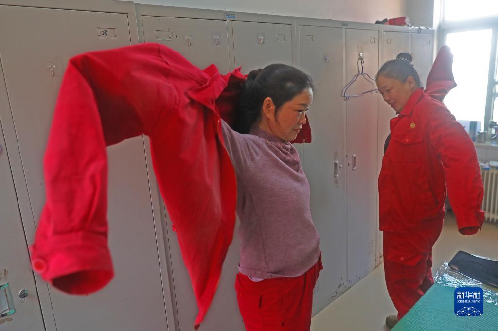 2月27日,余容(左)和李文靜在車間更衣室換上工服準備工作。新華社記者 楊青 攝