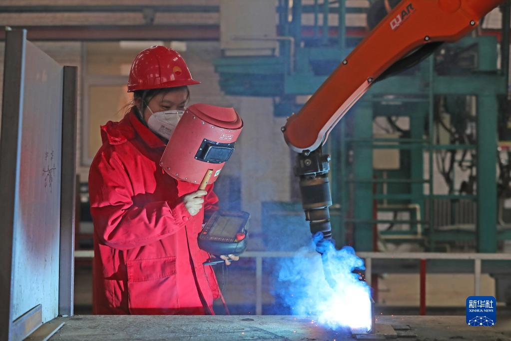 2月27日,楊景愛操作焊接機器人進行作業。新華社記者 楊青 攝