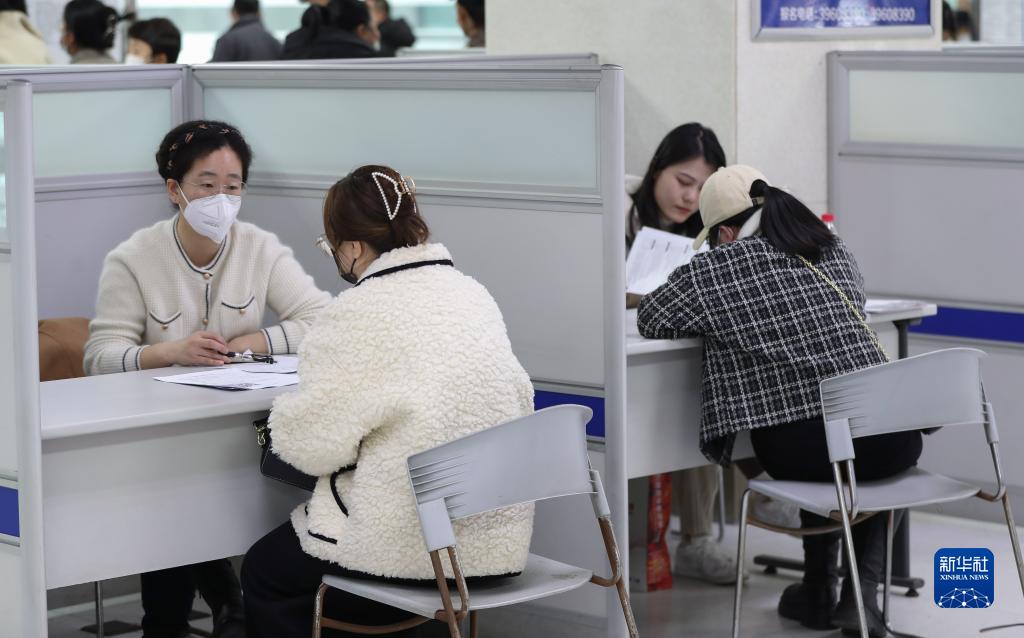 3月8日,在大連市人力資源市場,求職者與招聘企業工作人員交流。新華社記者 龍雷 攝
