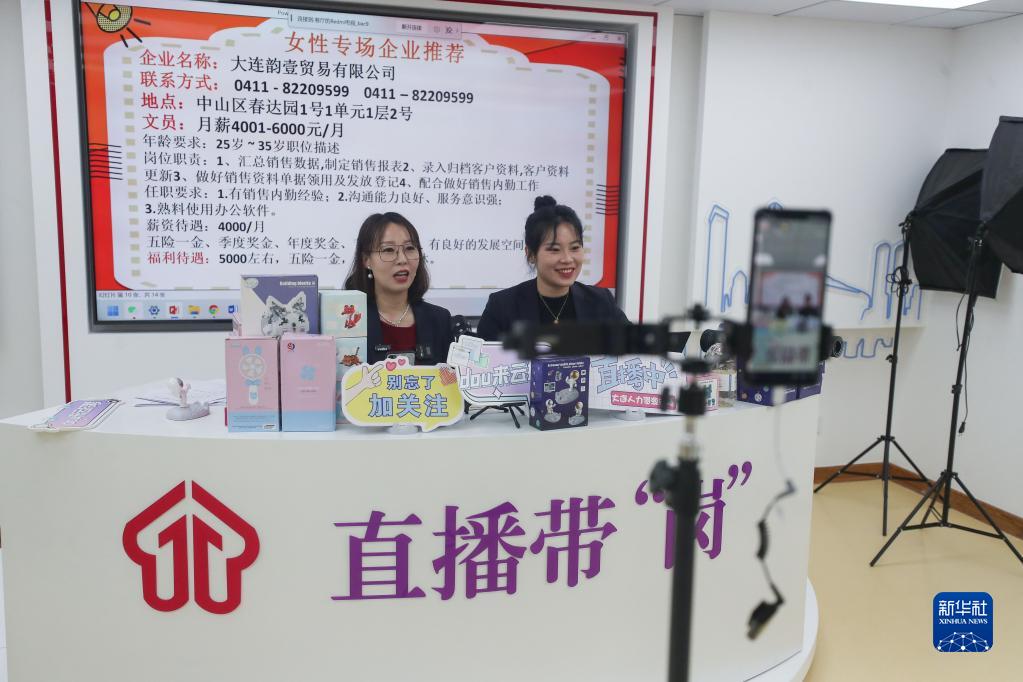 3月8日,大連市人力資源市場的工作人員通過視頻直播的方式介紹招聘企業和崗位的情況。新華社記者 龍雷 攝