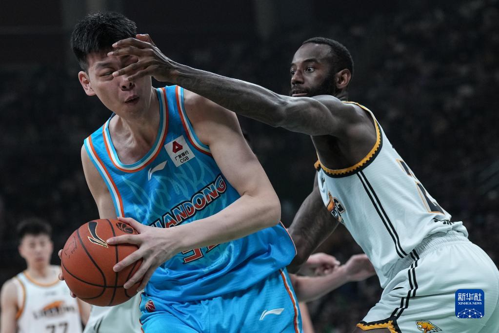 3月10日,山東高速隊球員朱榮振(左)在比賽中持球進攻。新華社記者 潘昱龍 攝