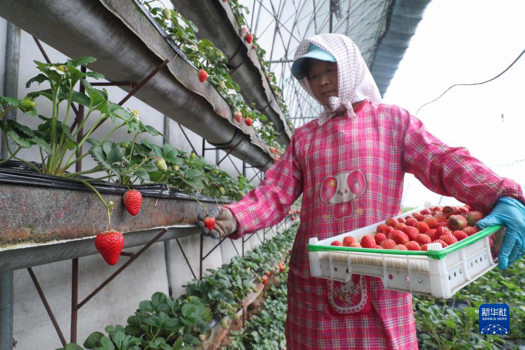 3月14日,村民在岫巖縣洋河鎮的草莓大棚采摘草莓。新華社記者 龍雷 攝