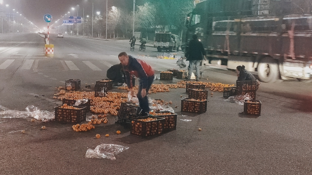 大家幫忙將撿起的一箱箱水果重新裝上貨車