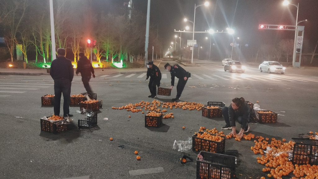 巡特警隊員和熱心市民幫助貨車司機撿拾水果(照片由營口市公安局提供)