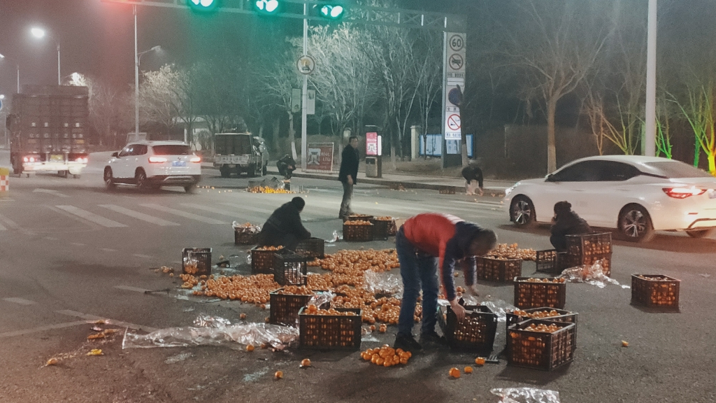 面對滿地的水果過往車輛紛紛繞行(照片由營口市公安局提供)