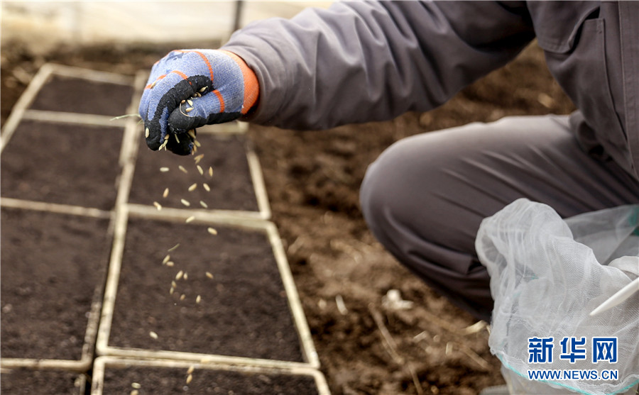 圖為工作人員在秧盤上撒種。新華網夏銘陽攝