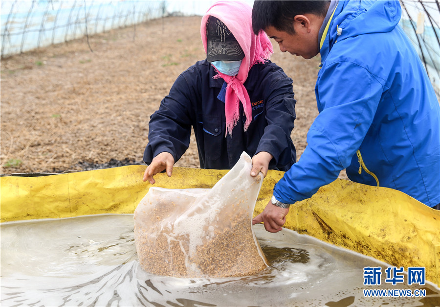 圖為遼寧天隆生物科技有限公司副總經理關峰(右一)在實驗大棚內進行育苗實驗。新華網夏銘陽攝