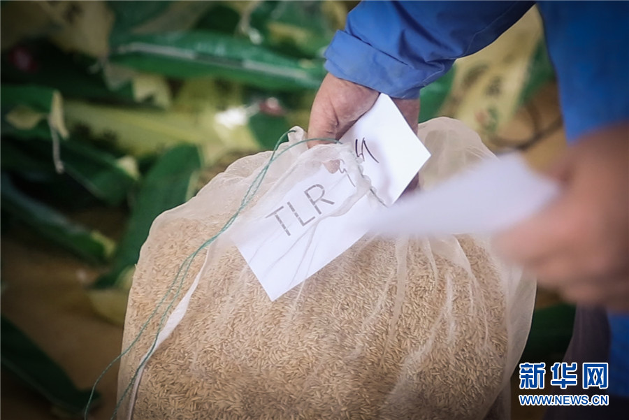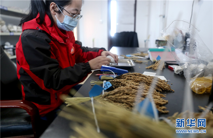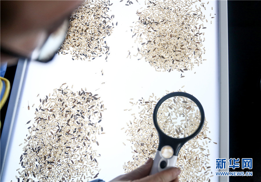 圖為在考種室,技術人員將實驗稻種進行分裝和編號。新華網夏銘陽攝