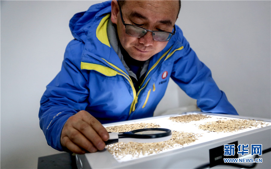 圖為關峰在凈度分析儀器上篩查種子。新華網夏銘陽攝