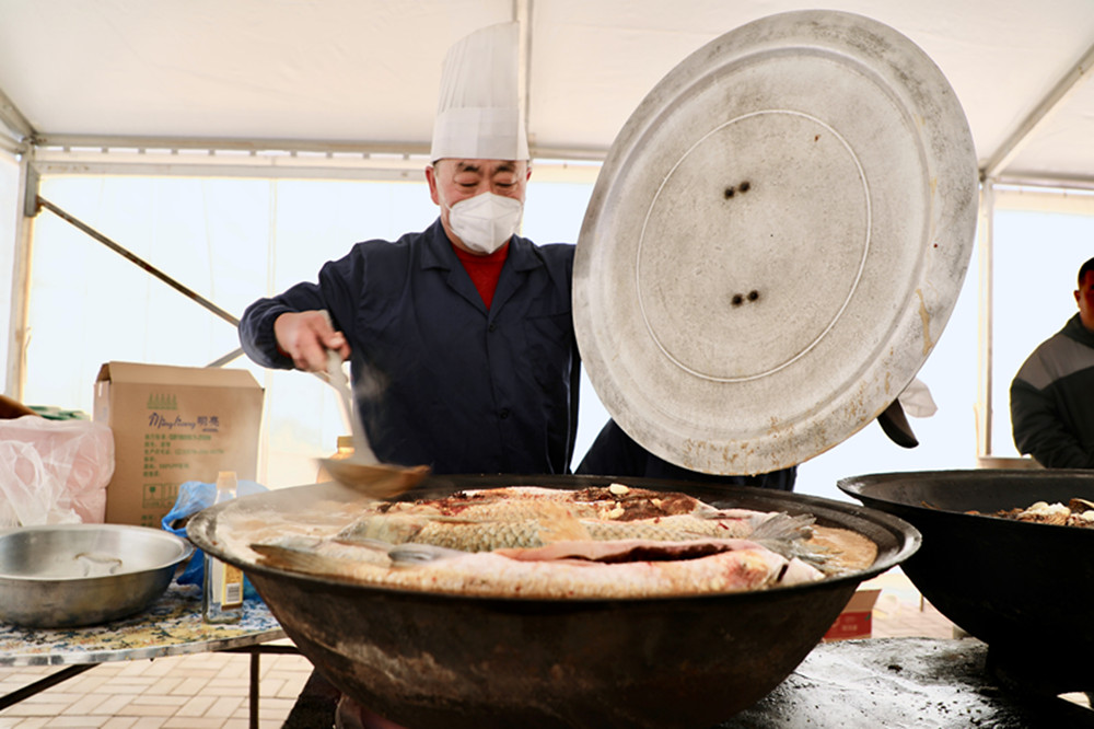 現場烹制的“開河第一魚”憑借湯鮮味美,獲得游客連連“點贊”?!伴_河魚又叫‘活人參’,肉質鮮美滑嫩,營養價值極高。每一口都是春天的味道。配上溫潤晶瑩的柴火鐵鍋燜米飯,魚湯泡飯更是滋味十足?!爆F場正在烹飪的廚師說道。為讓游客品嘗到春天的味道,“主廚”們早上5點多就開始忙活。