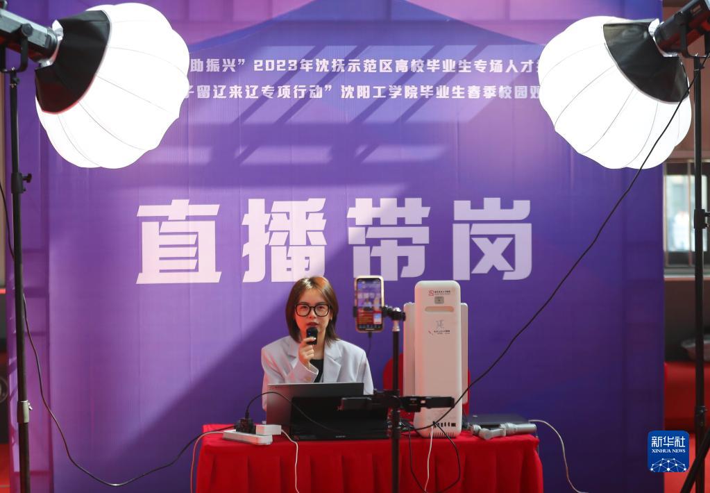 3月31日,在沈陽工學院體育館,直播帶崗專區工作人員通過網絡平臺對雙選會進行直播,滿足不能到場學生的就業需求。新華社記者 楊青 攝