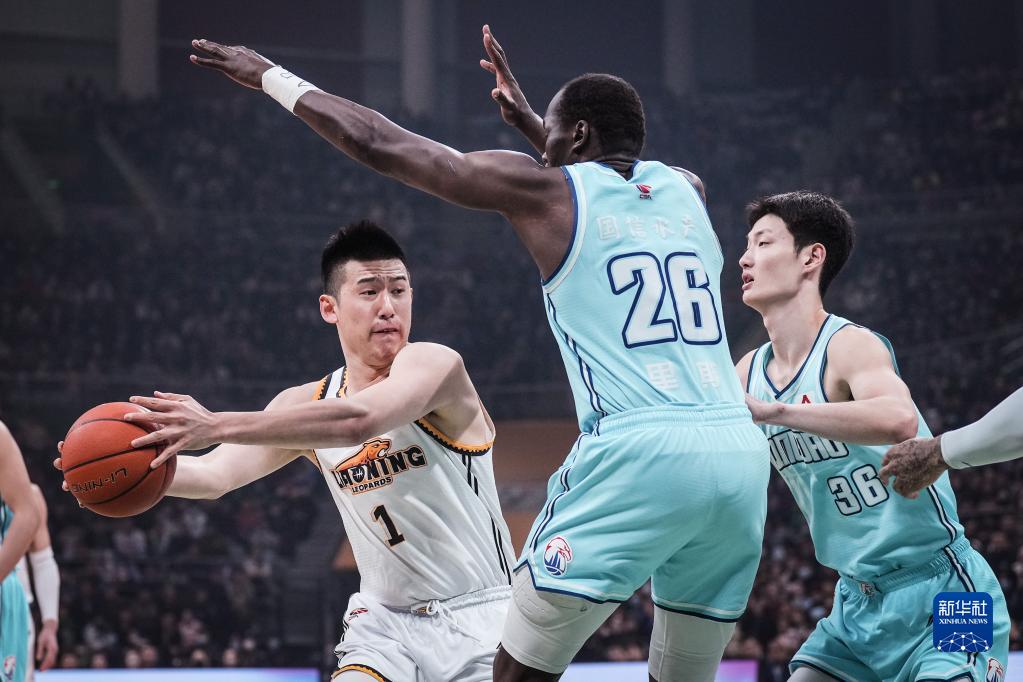 4月5日,遼寧本鋼隊球員付豪(左)在比賽中持球進攻。新華社記者 潘昱龍 攝