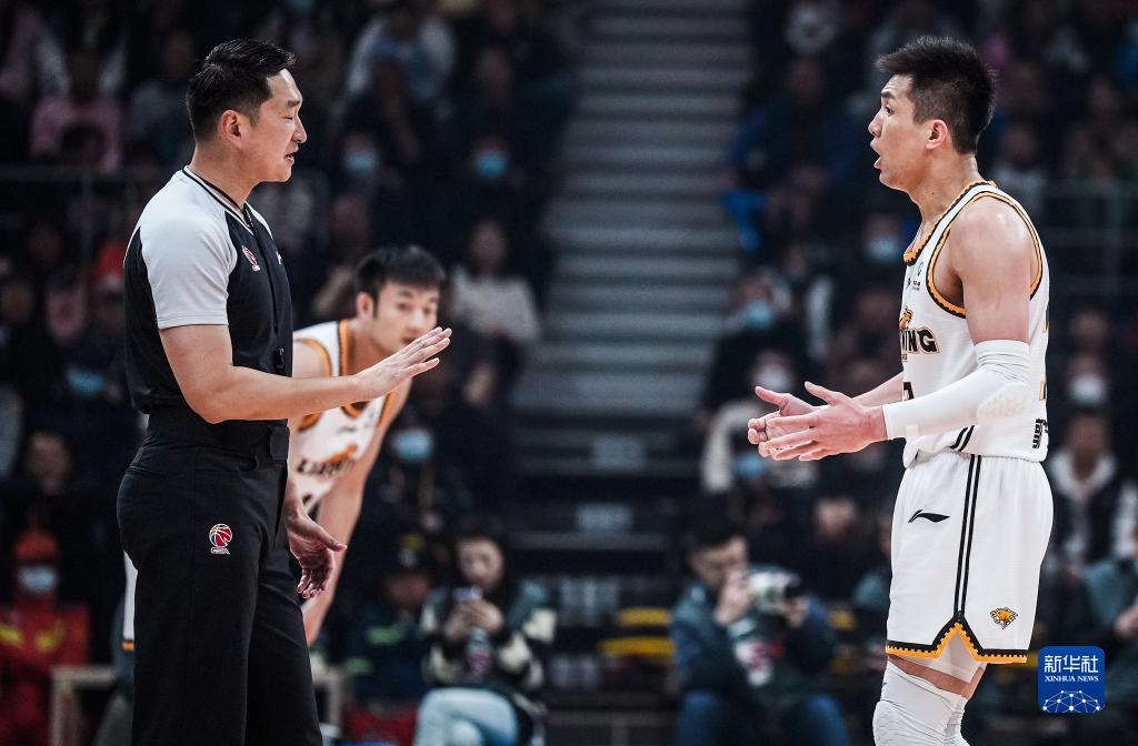 4月5日,遼寧本鋼隊球員郭艾倫(右)在比賽中與裁判溝通。新華社記者 潘昱龍 攝