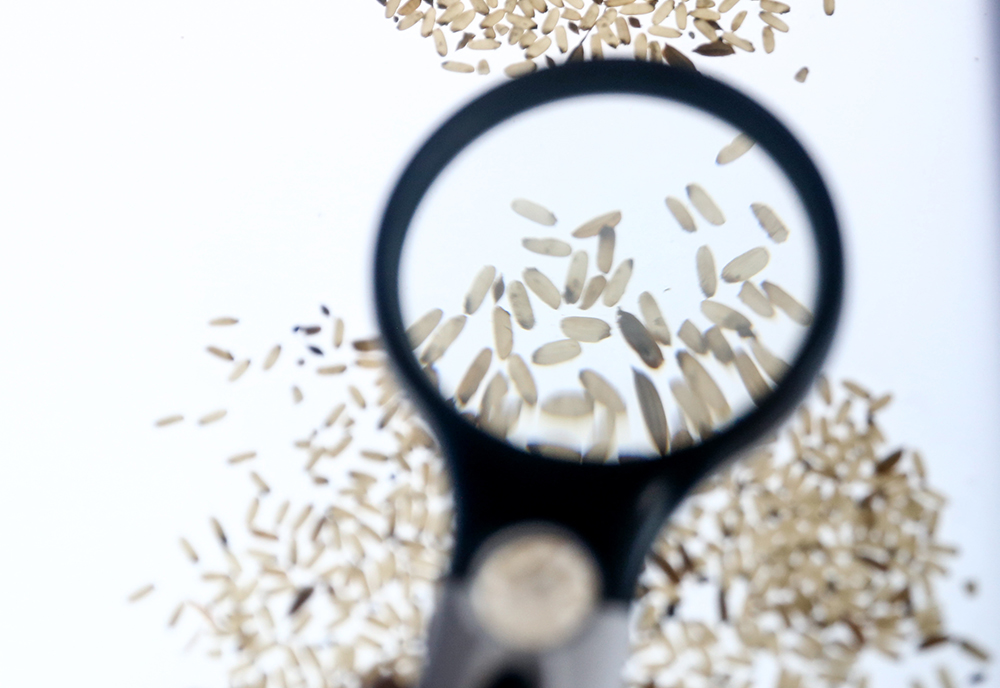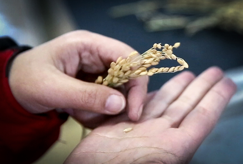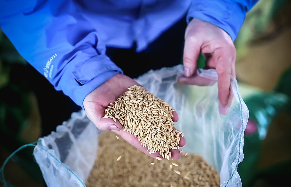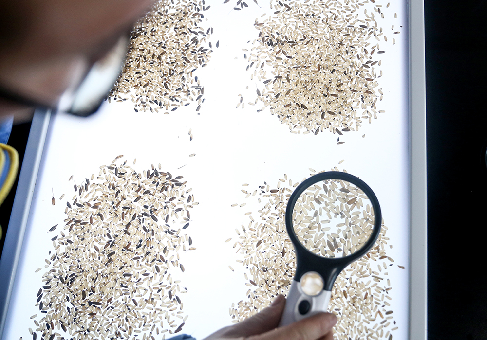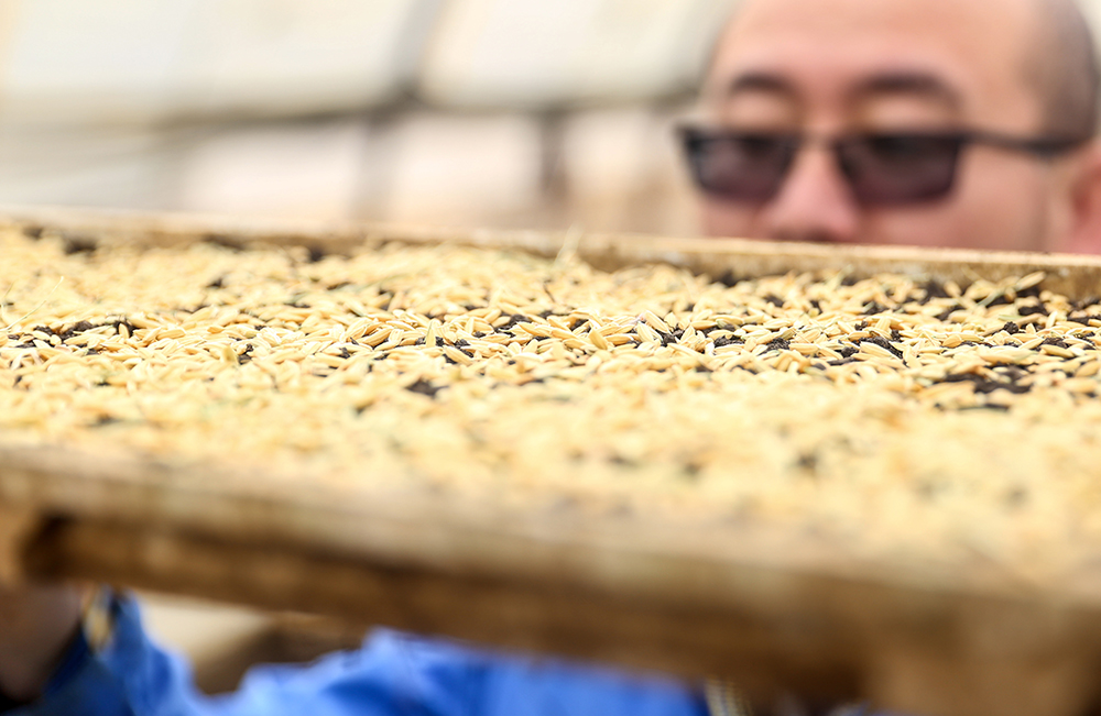 圖為“育種人”關峰查看即將進行封裝的稻種。新華網 夏銘陽 攝