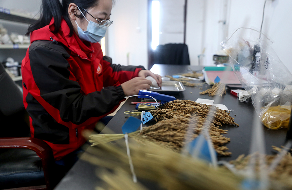 圖為在考種室,技術人員在將實驗稻種進行分裝和編號。新華網 夏銘陽 攝