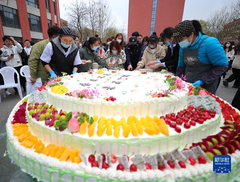 4月7日,學校食堂制作的巨型蛋糕供師生免費品嘗。新華社記者 楊青 攝