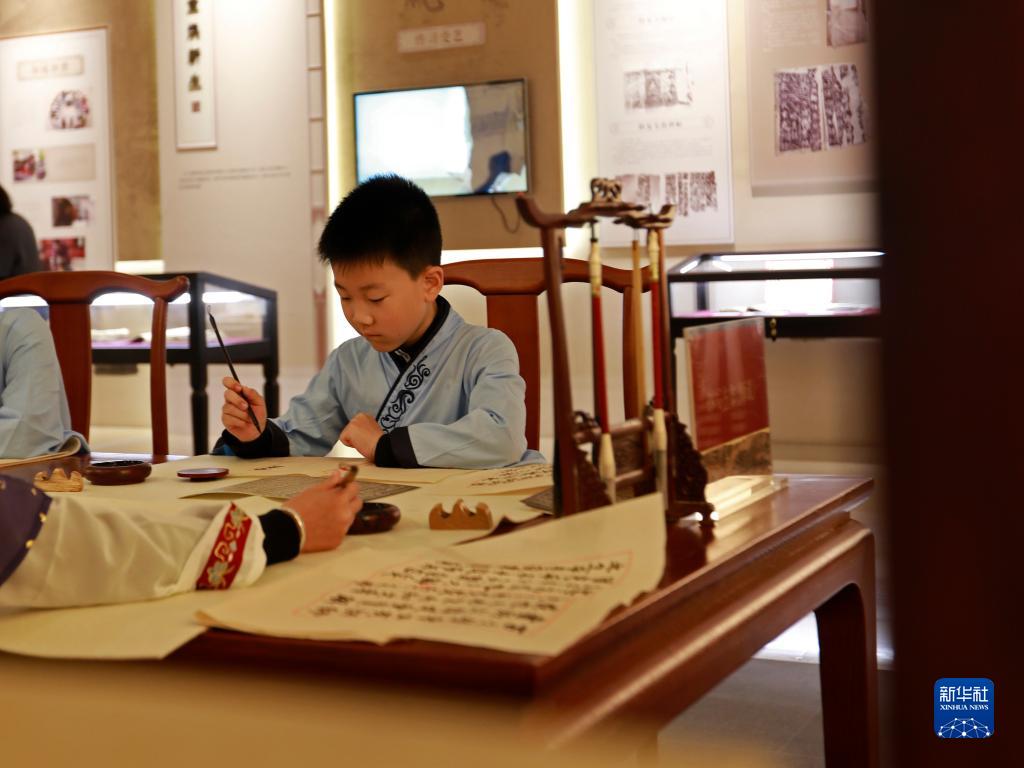 4月8日,觀眾在“繼往開來 國韻書香——古籍保護與傳承特展”中臨摹古籍碑帖。新華社記者 楊青 攝