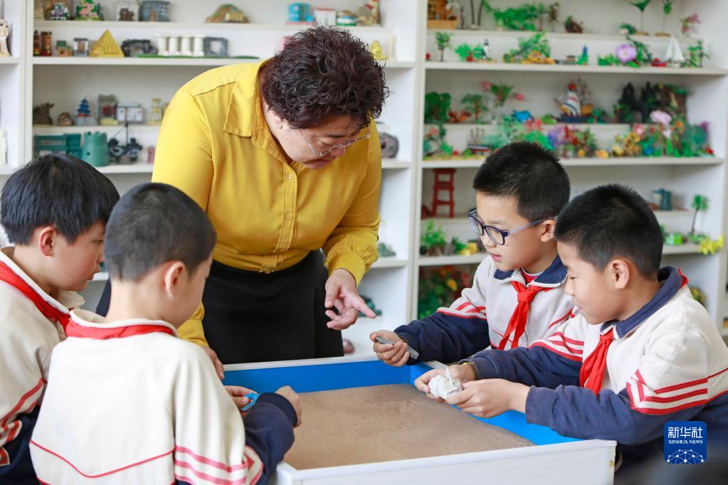 4月12日,大連市西崗區工人村小學的心理教師在心理輔導室陪學生一起擺放沙盤。新華社記者 陳為 攝