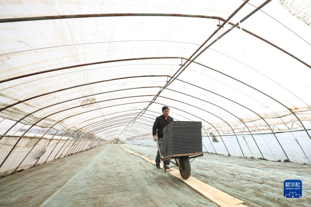 4月14日,盤錦市盤山縣的農戶在進行水稻秧苗育苗工作。新華社記者 潘昱龍 攝