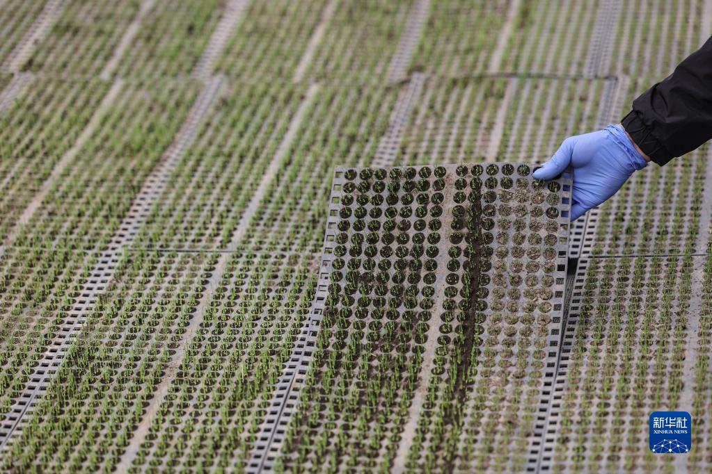 4月14日,盤錦市盤山縣的農戶在查看水稻秧苗的育苗情況。新華社記者 潘昱龍 攝