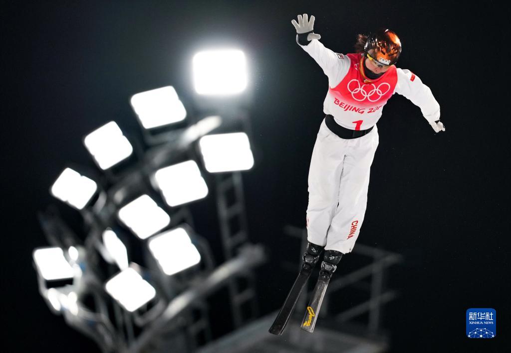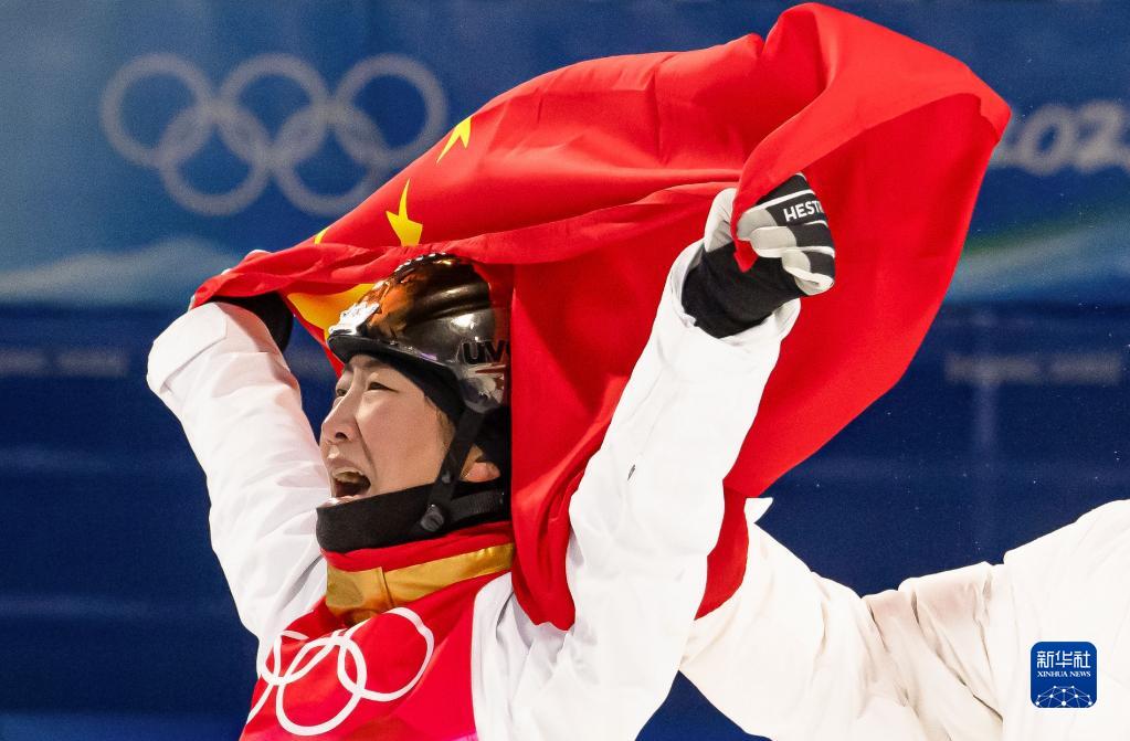 2022年2月14日,來自鞍山的中國選手徐夢桃在張家口云頂滑雪公園舉行的北京2022年冬奧會自由式滑雪女子空中技巧決賽中獲得冠軍。新華社記者牟宇、肖藝九攝