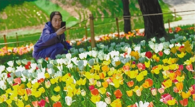 圖為盛開的郁金香吸引游客駐足拍攝。