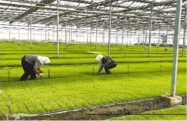 4月25日,在盤山縣太平街道張家村凱地農機服務專業合作社一棟5000平方米的高科技設施農業大棚里,2萬多個規格統一的“亞美柯”缽盤整齊地排列其間,一顆顆茁壯成長的綠色水稻秧苗,綻放出令人愉悅的生機與活力。