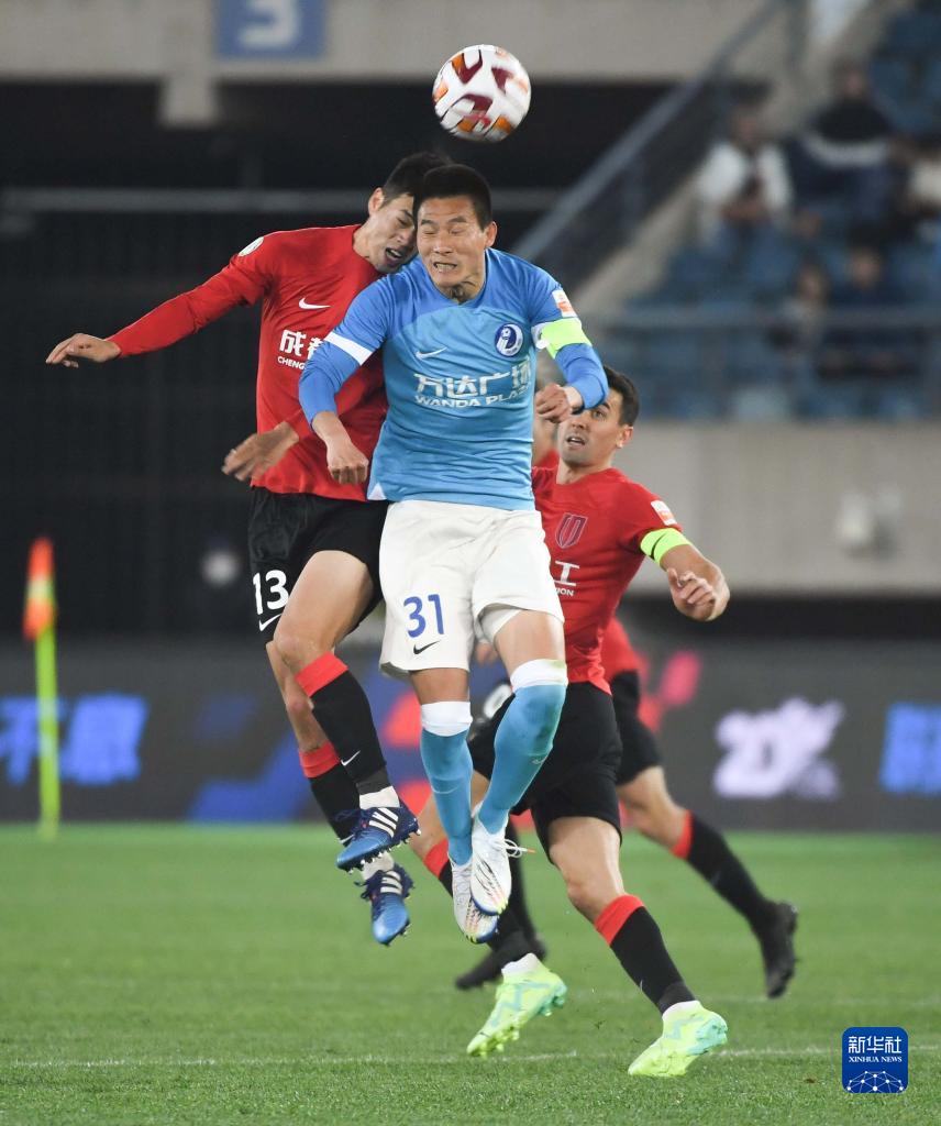 4月26日,成都蓉城隊球員胡靖(左)在比賽中與大連人隊球員呂鵬爭頂。新華社記者 龍雷 攝