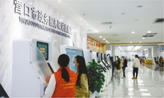 營口市政務服務中心志愿者正指導辦事人員使用網絡服務平臺。(受訪單位供圖)