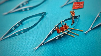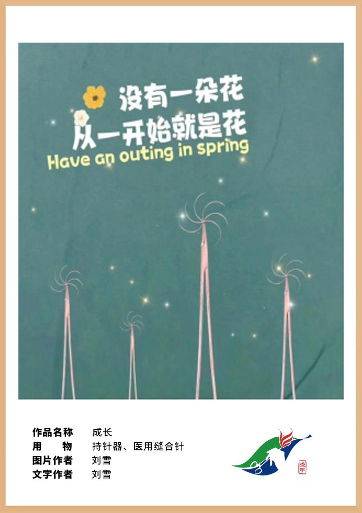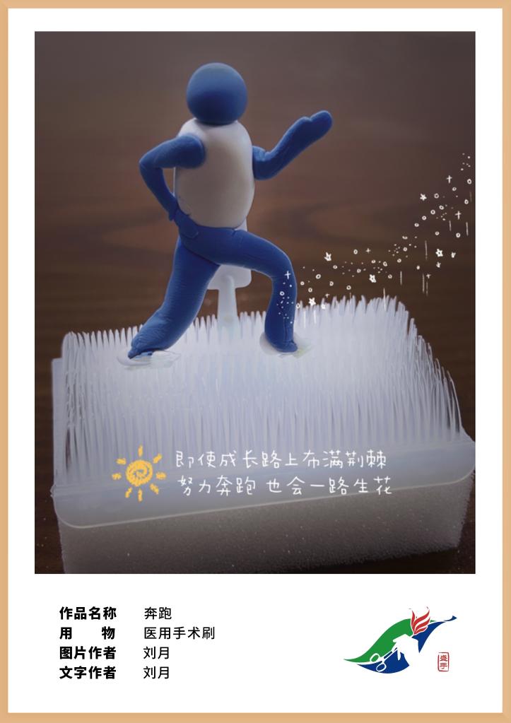 醫用手術刷上奔跑的藍色人偶,展現護士們不畏艱難險阻的豪情;持針器和醫用縫合針組成的作品《成長》,寄托生命之花盡情綻放的愿望;由眼科顯微剪刀組成的小船,帶著護士們“乘風破浪”;由醫用紗布敷料組成的泳道,引導護士們奮勇向前……一張張創意海報,講述著護士們對護理行業的執著與熱愛。