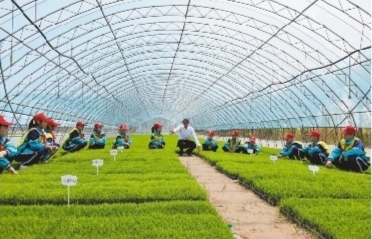 圖為學生們在育苗基地了解稻苗的生長情況。