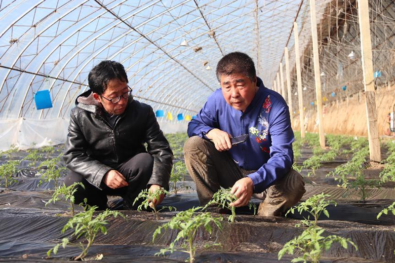 丁愛民正在蔬菜大棚內觀察西紅柿秧苗 鐵嶺縣委宣傳部供圖