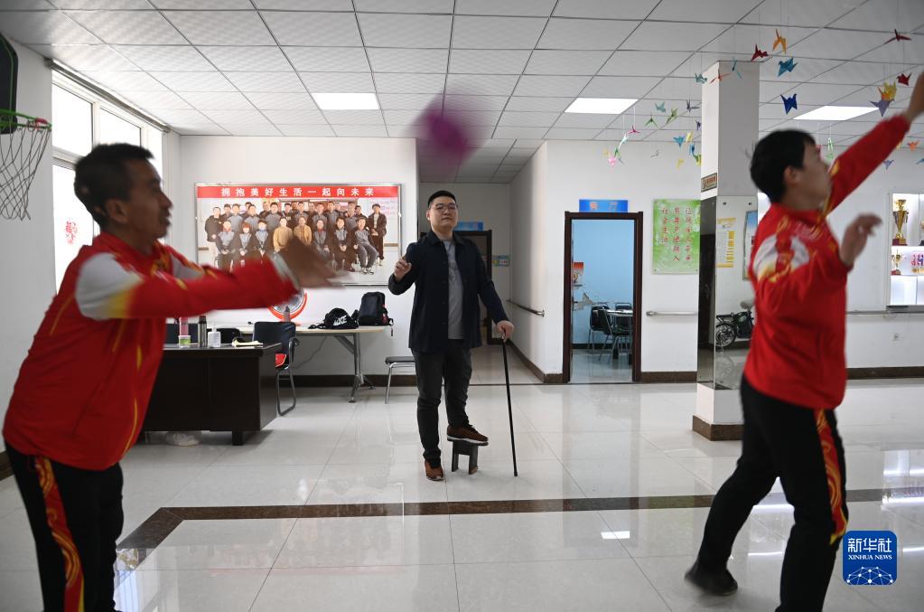 趙強(中)在陽光家園指導學員練習籃球(4月18日攝)。