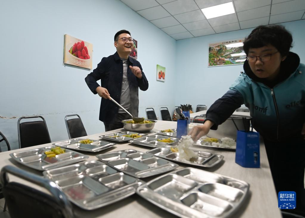 趙強(左)在陽光家園食堂為學員準備午餐(4月18日攝)。