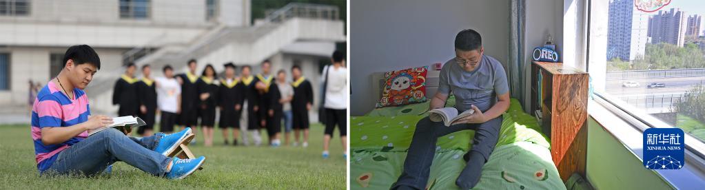 拼版照片: 左圖為2014年6月5日,趙強在東北大學校園里看書;右圖為2023年4月18日,趙強在家中看書。