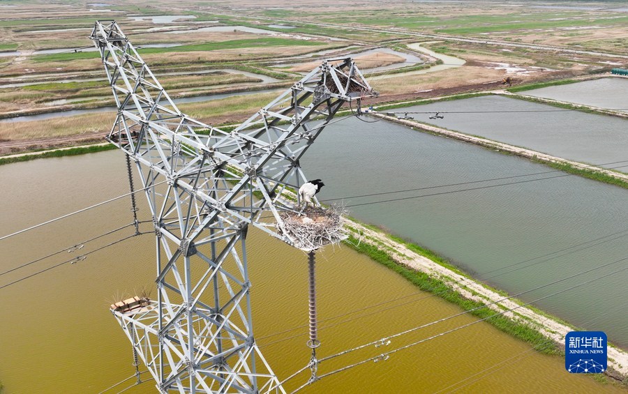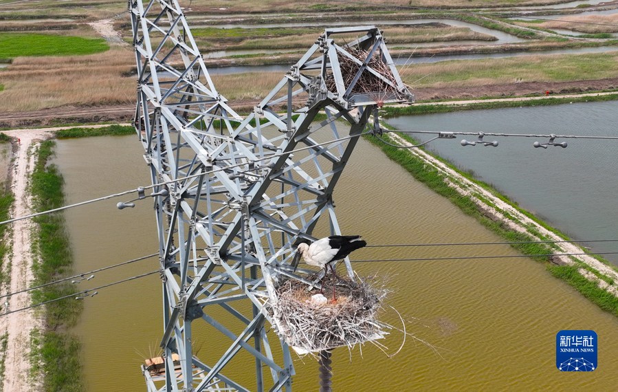 5月24日,成年東方白鸛在鐵塔上照顧幼鳥。新華社記者 楊青 攝