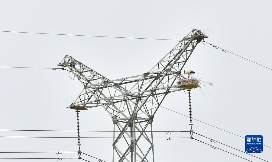 5月24日,成年東方白鸛在鐵塔上棲息。新華社記者 楊青 攝