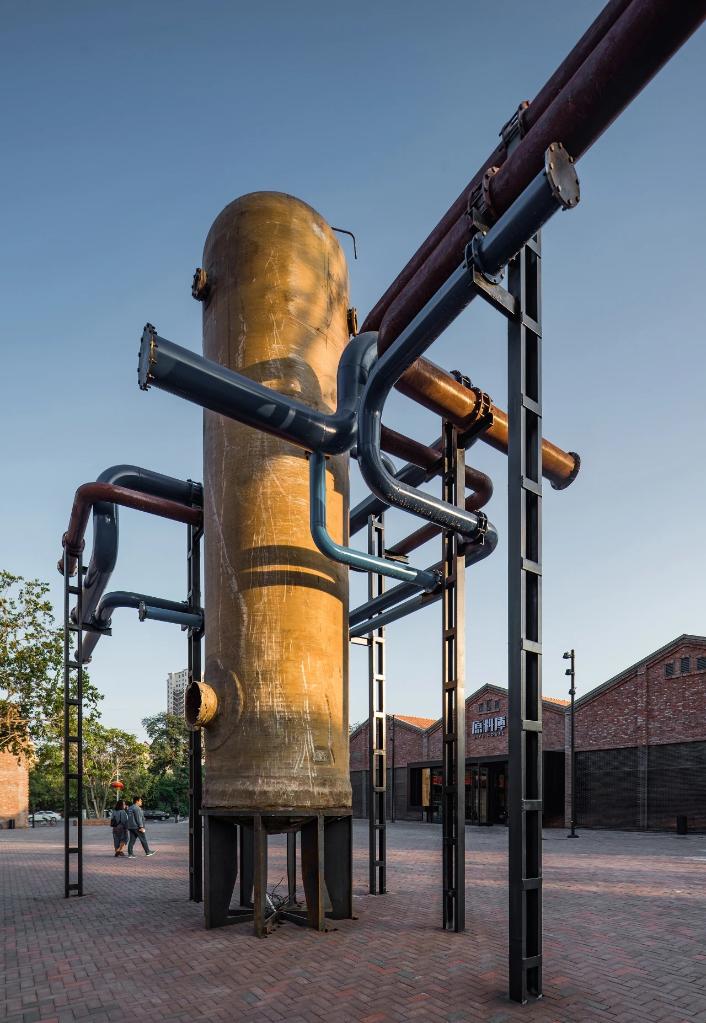 圖為紅梅文創園內,用老工廠遺留的管道與發酵罐組合而成的塑像。(受訪單位供圖)