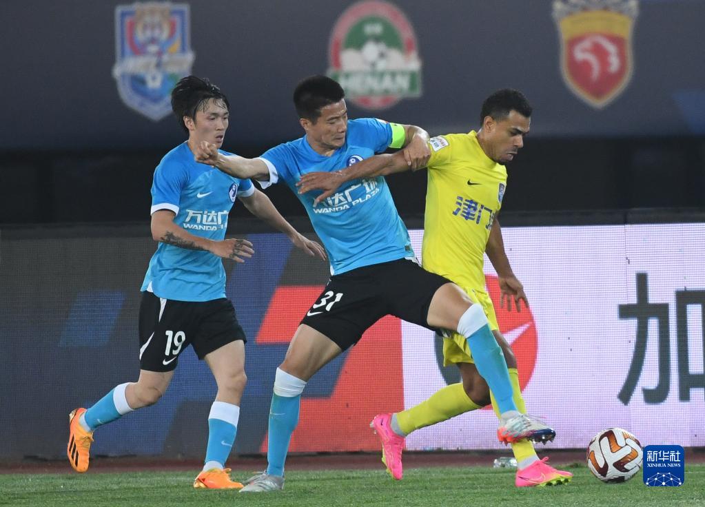 5月28日,大連人隊球員呂鵬(中)在比賽中防守天津津門虎隊球員羅薩。新華社記者 龍雷 攝