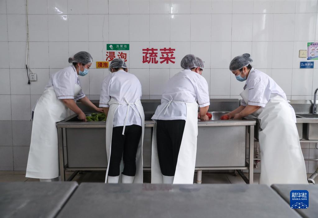 6月1日,沈陽市第一二0中學食堂工作人員在洗菜。新華社記者龍雷攝