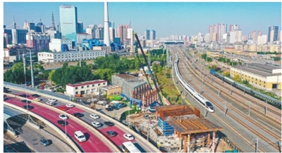 6月8日,工人在位于沈陽北站附近的沈白高鐵沈陽樞紐改建工程上施工。日前,沈白高鐵建設并入沈陽北站第一階段施工順利完成。據了解,沈白高鐵是國家中長期鐵路網中東北東部快速鐵路通道的重要組成部分,也是東北地區“十四五”期間重大高鐵建設項目。(記者 張文魁)